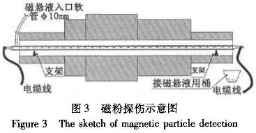 磁悬液装置:选用带搅拌器的自制压力泵,用压缩空气加压,泵上装有压力表,以观察实际压力。由一人专门操作,控制磁悬液的开关以及压力值。磁悬液采用黑色油悬液,不能用荧光磁粉,因为孔太小,无法用紫外灯观察。内孔淸理:将不起毛的布捆成团,用铁丝牵